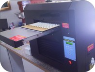 Painter canvas, CD's and DVD's, etc. In full colour. You can print on items 20 cm. thick and you can do low volumes as well as high volumes.