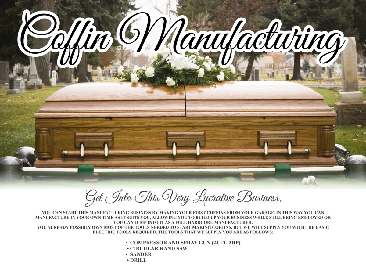 You will be able to make 20 coffins per week depending on your woodworking skills. Obviously, as you start making more coffins, you will need bigger machines, staff and a larger premises. With the profit of the sale of your coffins, you will easily be able to afford all this.